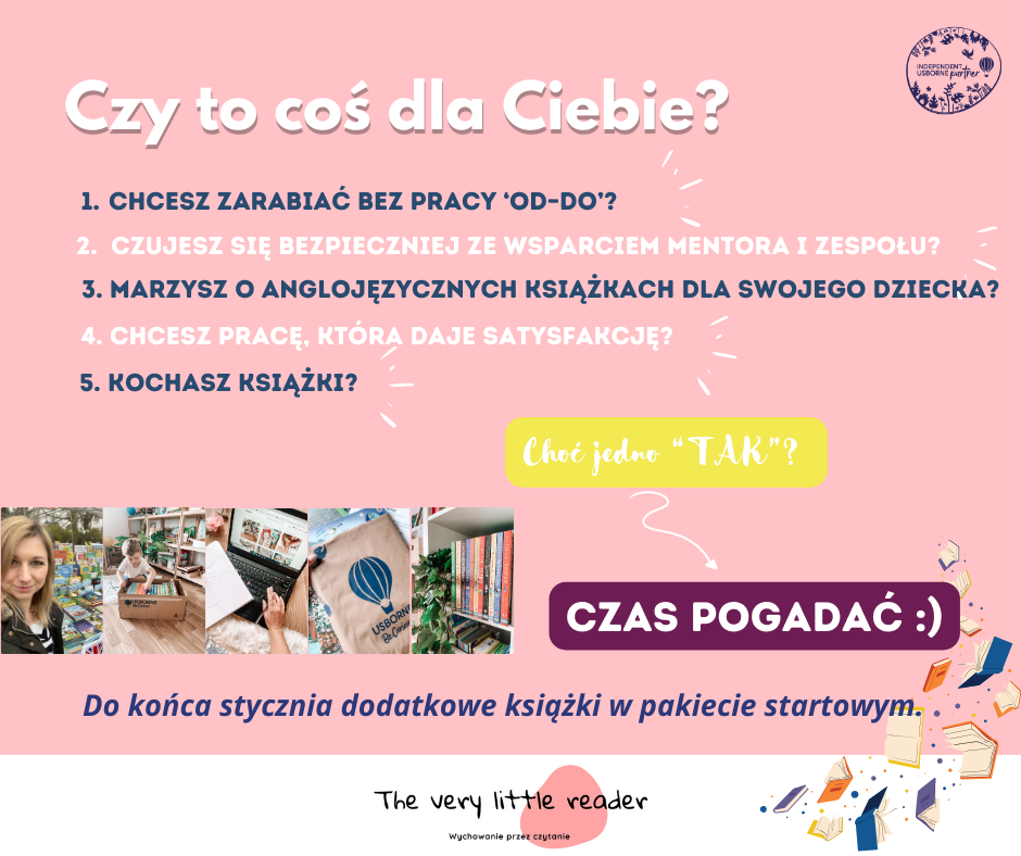 Powodów do założenia jest multum – chociażby pakiet startowy to złoto. Ale nie o sam pakiet w tym wszystkich chodzi. Współpraca z Usborne daje Ci możliwość prowadzenia swojego biznesu bez wielkich nakładów finansowych. Na własnych zasadach – bo to ty jesteś swoją szefową. Pracujesz kiedy chcesz i jak chcesz. Ale za to ze wsparciem mentorki i społeczności Partnerek. A jeśli znasz książki Usborne to wiesz, że są to wyjątkowe pozycje, które kochają zarówno dzieci, rodzice jak i nauczyciele.